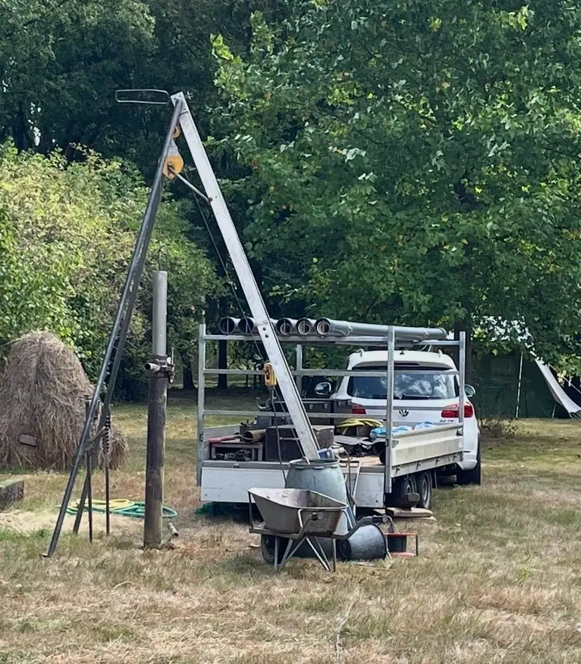 We hebben onze 3 poten van de driepoot, deze zijn alle 3 zo’n 4 mtr lang. Om de put te kunnen maken moeten deze 3 poten naar de locatie kunnen komen waar de put gemaakt moet worden, hier dient rekening mee gehouden te worden. Alle andere materialen worden per kruiwagen aangevoerd, dus deze moet van onze aanhanger naar de locatie van de put kunnen komen.