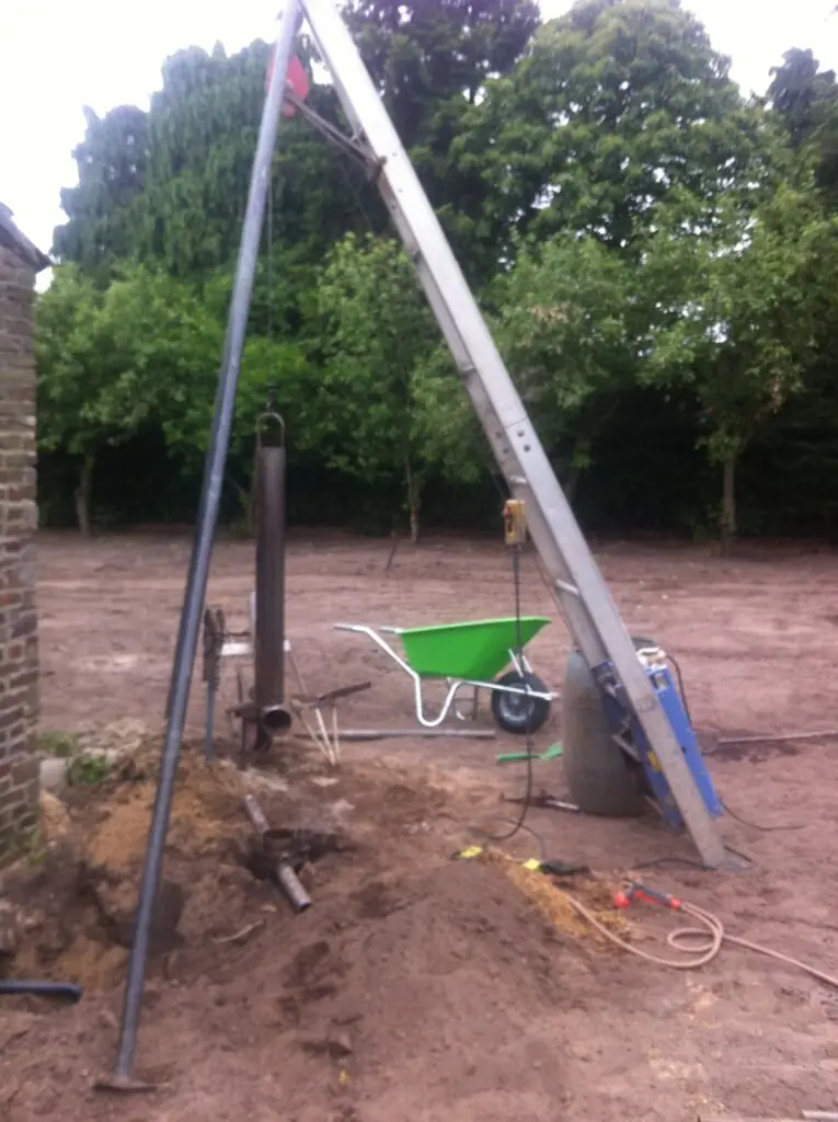 Ik maak de putten nog op de ouderwetse manier d.m.v. het zogenoemde pulsen, dit gebeurd handmatig met een driepoot.